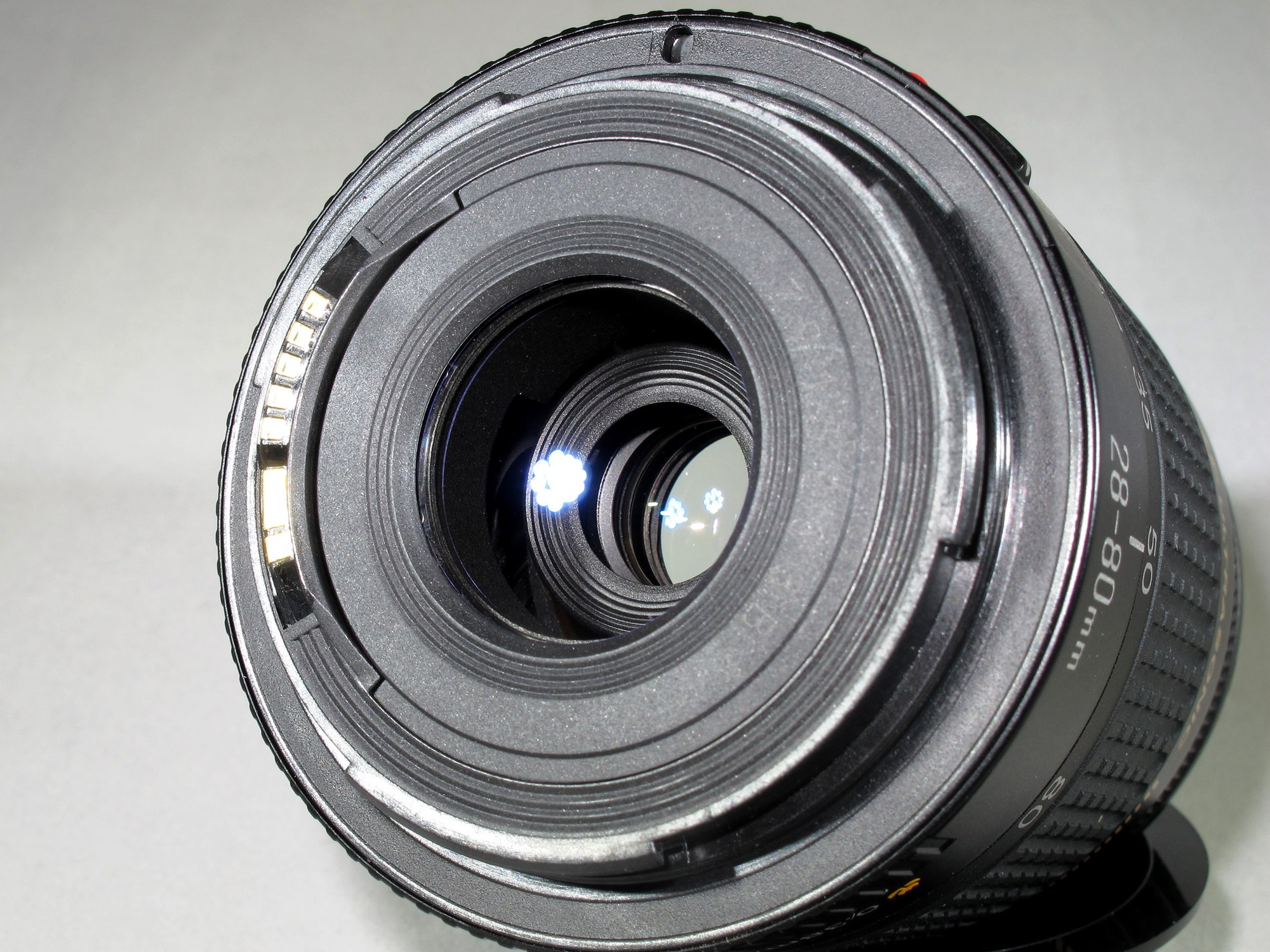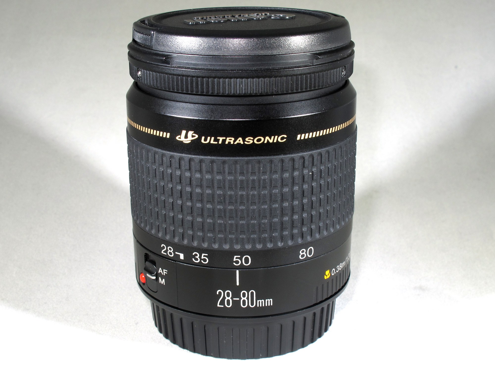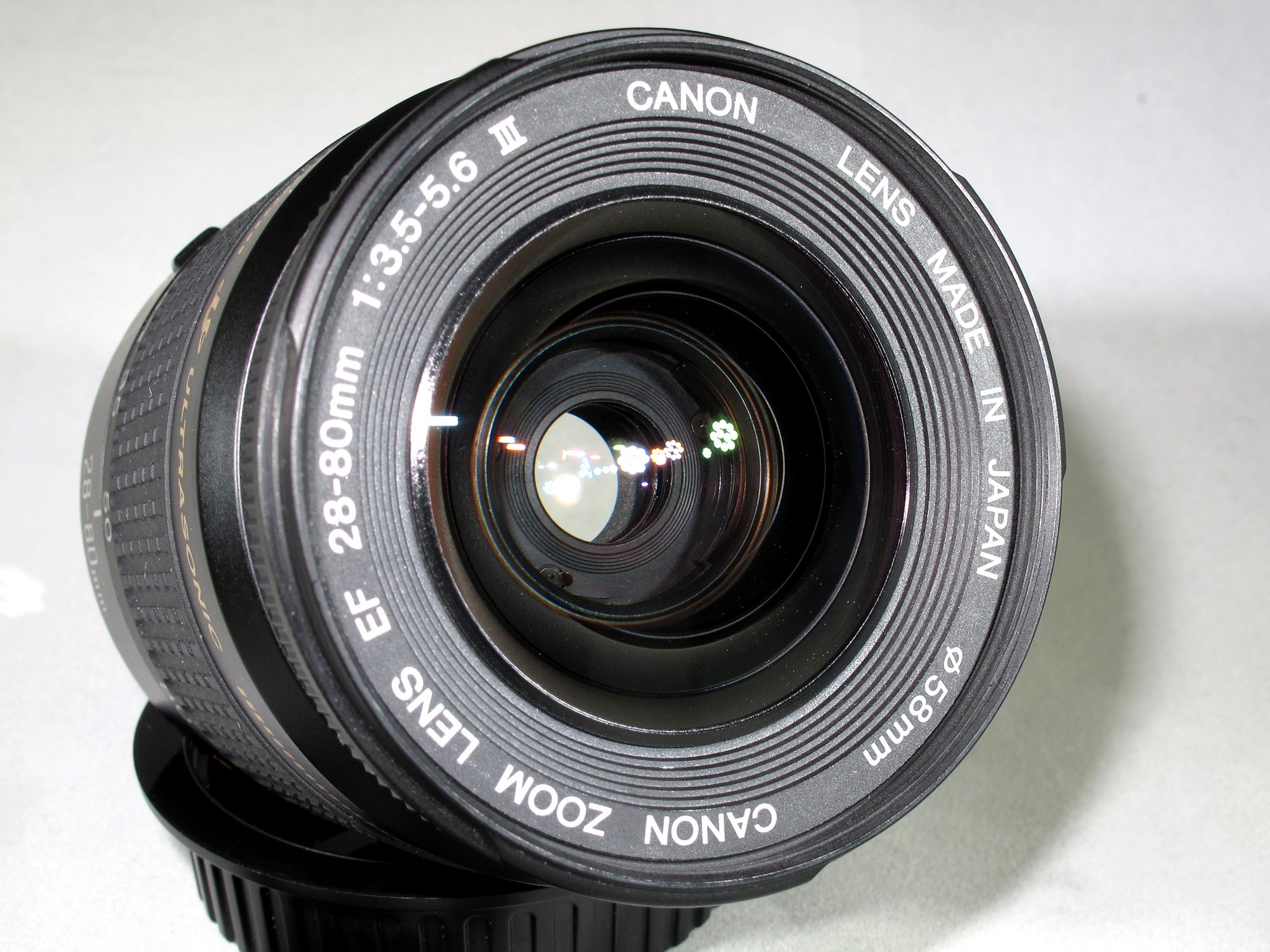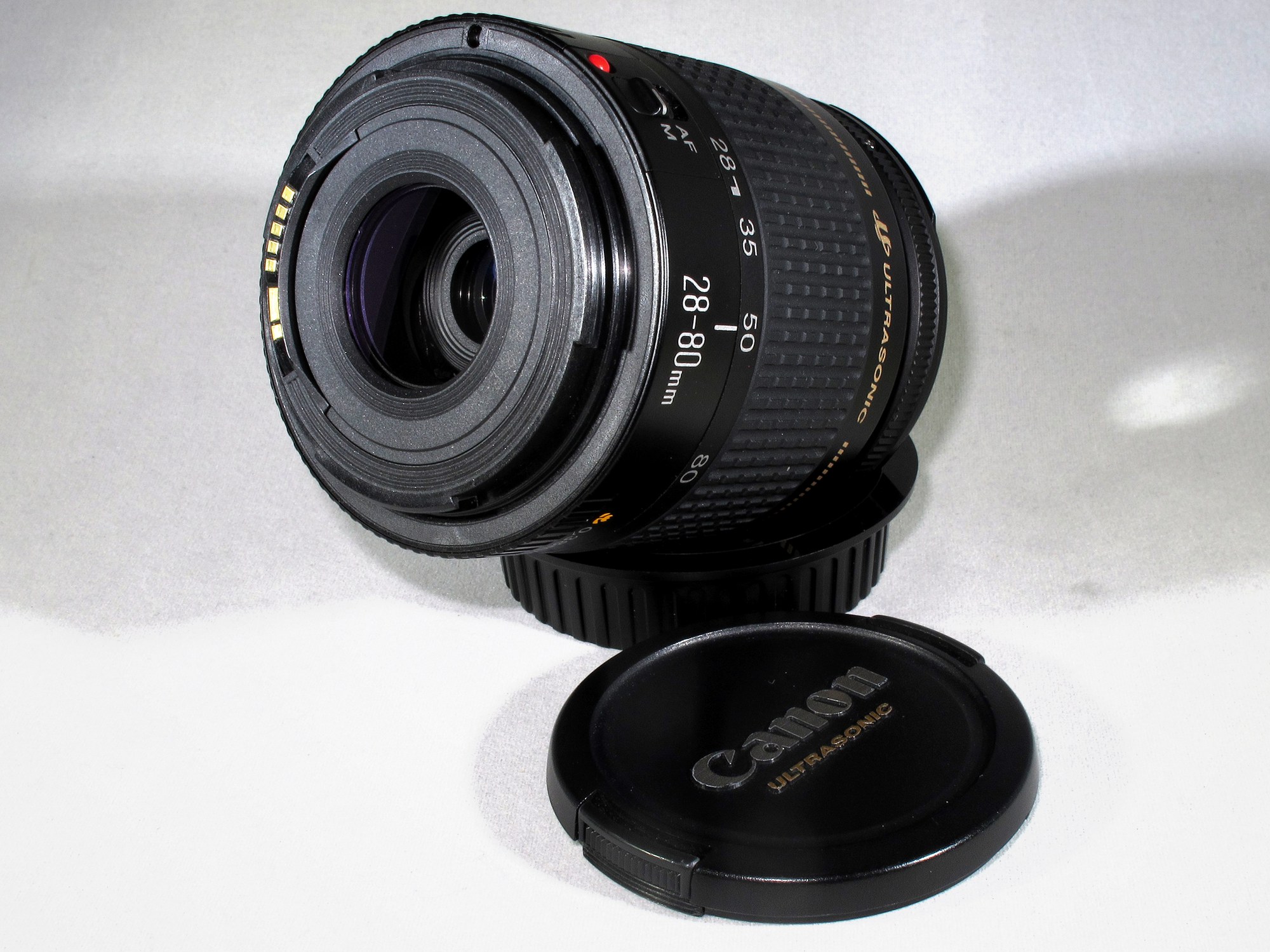 Used but in excellent condition, professionally re-calibrated and cleaned inside and out. Comes with original caps. For film or digital Canon EOS cameras.